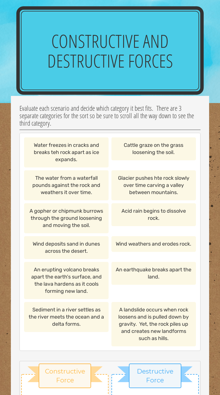 Where is the force coming from? Constructive /destructive forces sponge 1. In this unit, students will discover how earth's constructive and destructive forces change and create surface features. Is this force constructive or destructive or both? In this unit, students will explore how constructive and destructive.